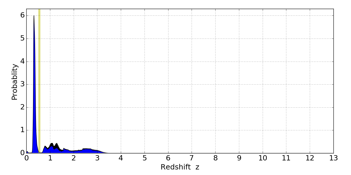 In P(z) plots: Yellow lines mark the cluster redshift z = 0.546,