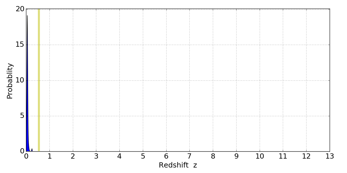In P(z) plots: Yellow lines mark the cluster redshift z = 0.546,