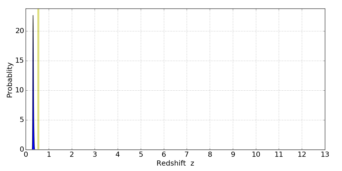 In P(z) plots: Yellow lines mark the cluster redshift z = 0.546,