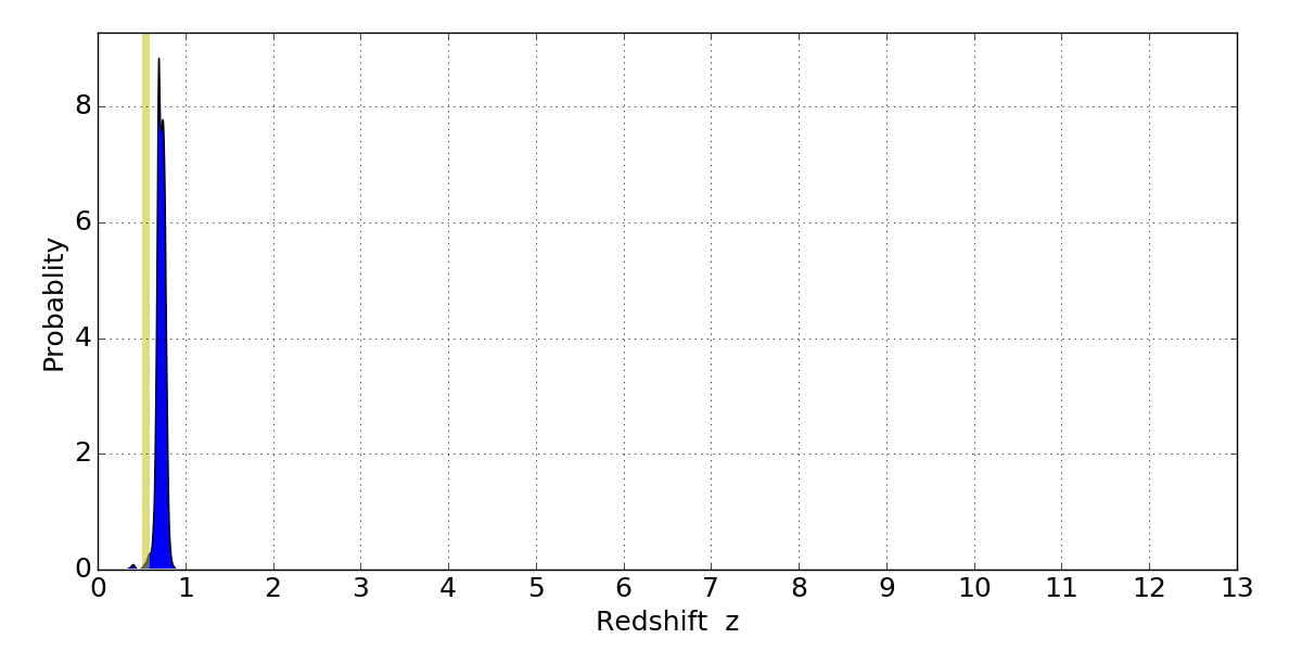 In P(z) plots: Yellow lines mark the cluster redshift z = 0.546,