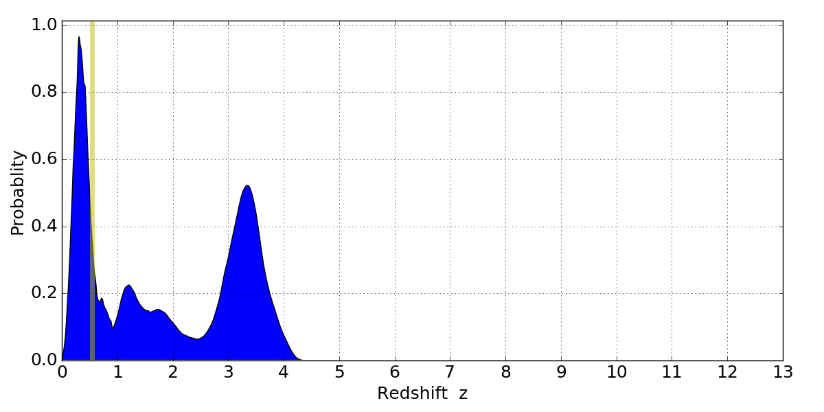 In P(z) plots: Yellow lines mark the cluster redshift z = 0.546,