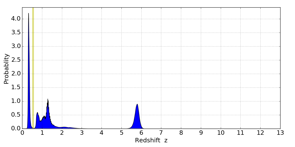 In P(z) plots: Yellow lines mark the cluster redshift z = 0.546,