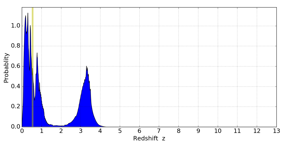 In P(z) plots: Yellow lines mark the cluster redshift z = 0.546,