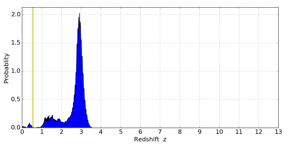 In P(z) plots: Yellow lines mark the cluster redshift z = 0.546,