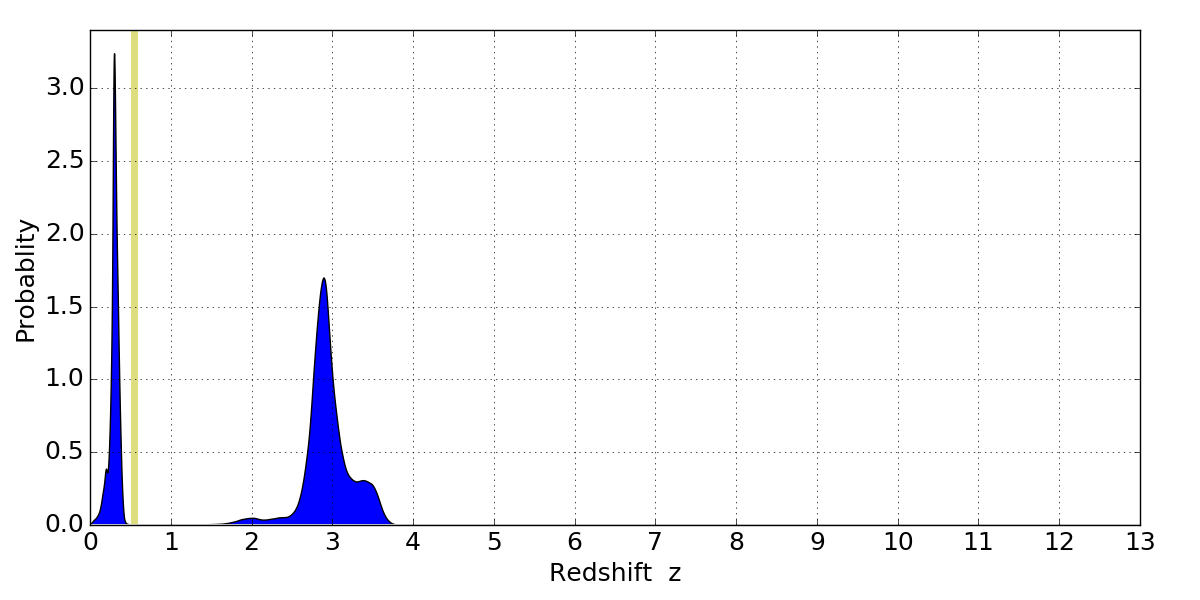 In P(z) plots: Yellow lines mark the cluster redshift z = 0.546,