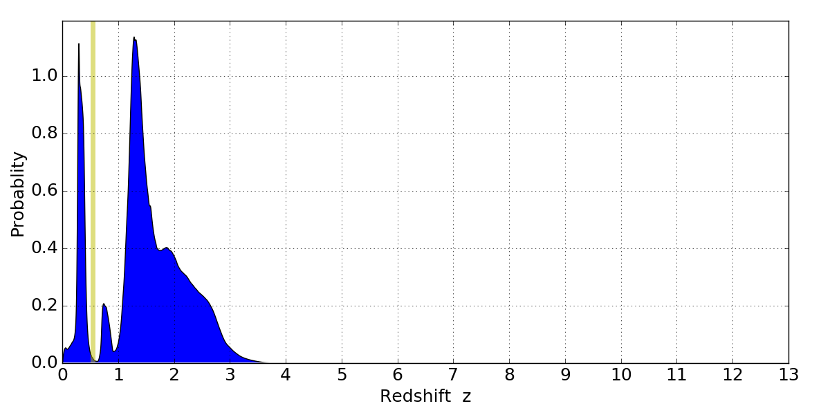 In P(z) plots: Yellow lines mark the cluster redshift z = 0.546,