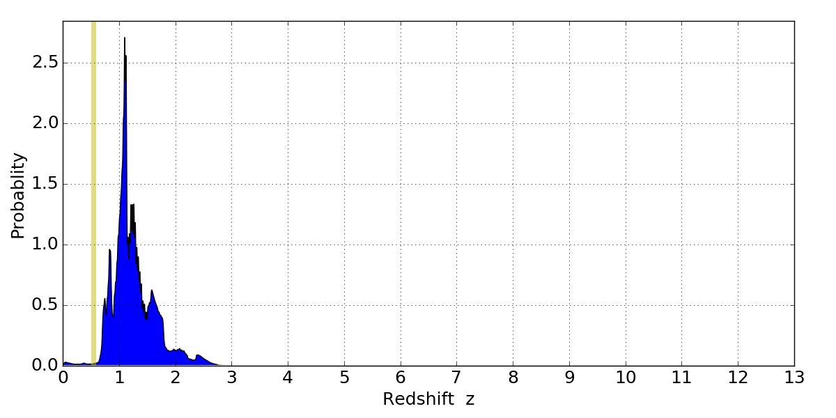 In P(z) plots: Yellow lines mark the cluster redshift z = 0.546,
