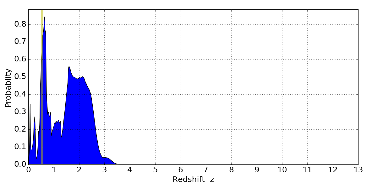 In P(z) plots: Yellow lines mark the cluster redshift z = 0.546,