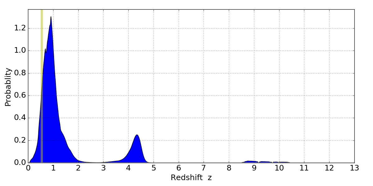 In P(z) plots: Yellow lines mark the cluster redshift z = 0.546,