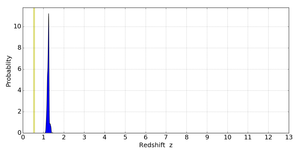 In P(z) plots: Yellow lines mark the cluster redshift z = 0.546,