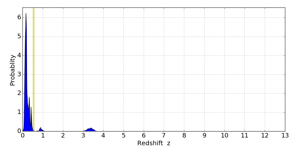 In P(z) plots: Yellow lines mark the cluster redshift z = 0.546,