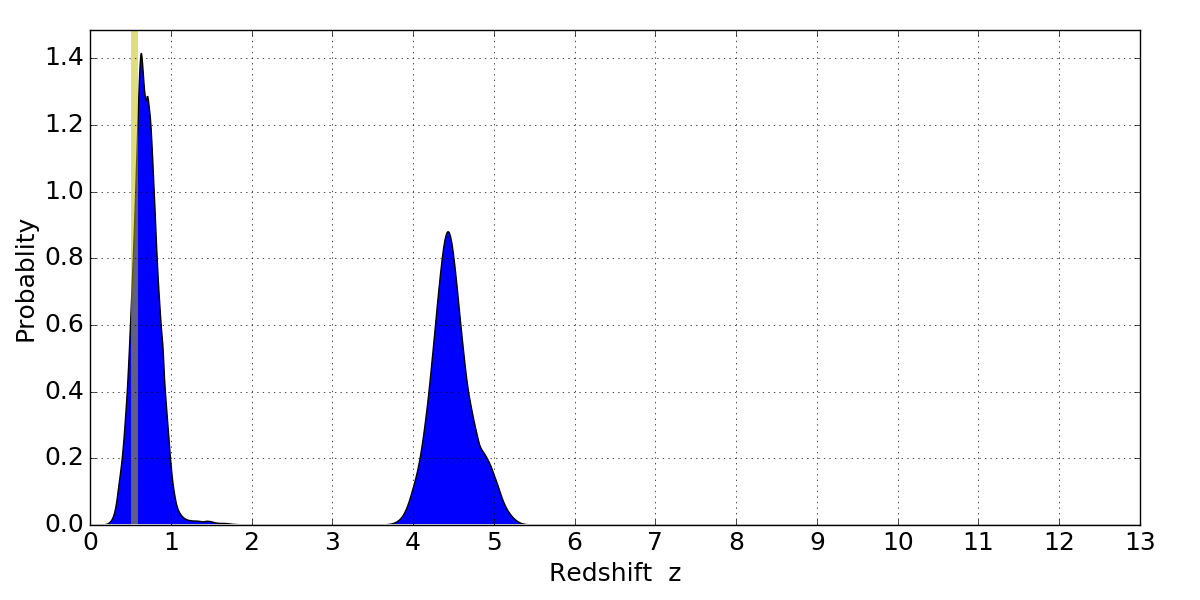 In P(z) plots: Yellow lines mark the cluster redshift z = 0.546,