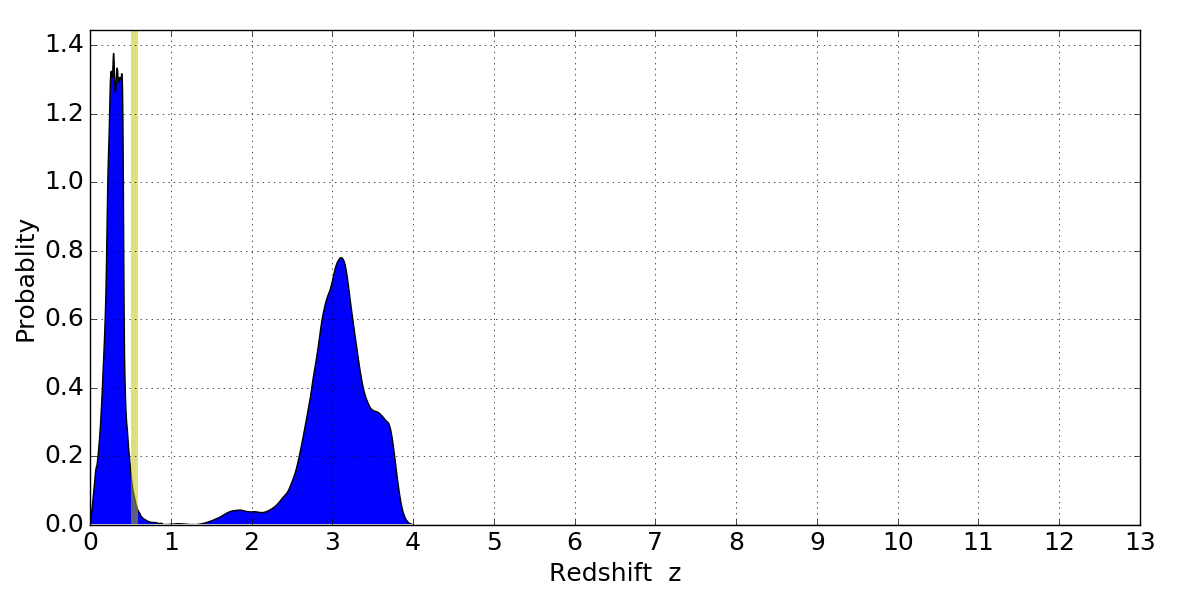 In P(z) plots: Yellow lines mark the cluster redshift z = 0.546,