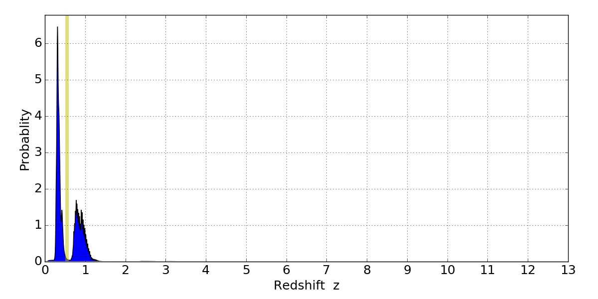 In P(z) plots: Yellow lines mark the cluster redshift z = 0.546,