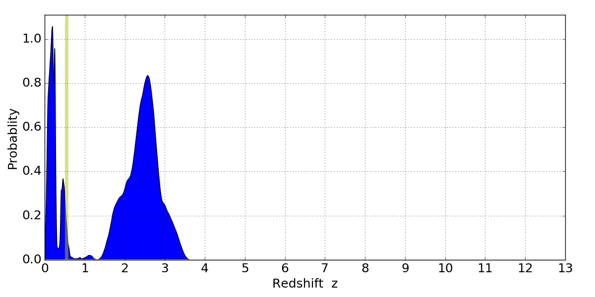 In P(z) plots: Yellow lines mark the cluster redshift z = 0.546,