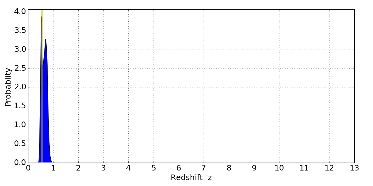 In P(z) plots: Yellow lines mark the cluster redshift z = 0.546,