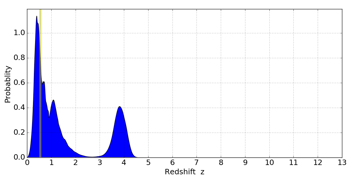 In P(z) plots: Yellow lines mark the cluster redshift z = 0.546,