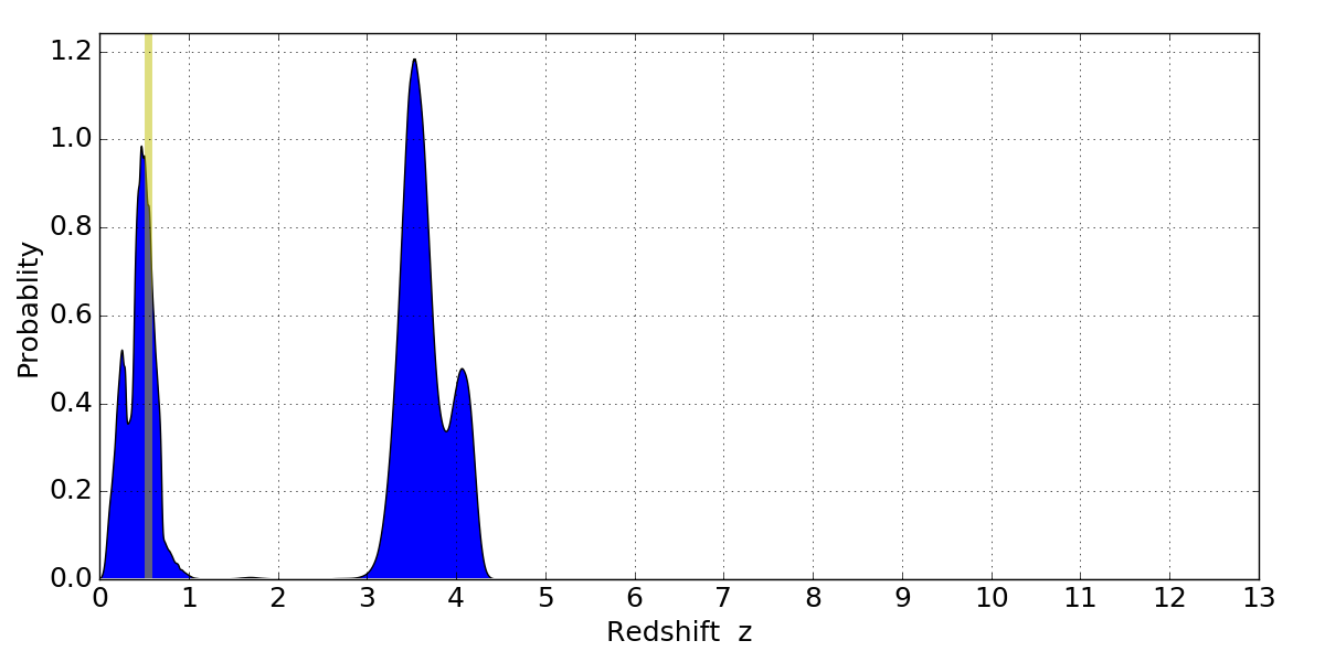 In P(z) plots: Yellow lines mark the cluster redshift z = 0.546,