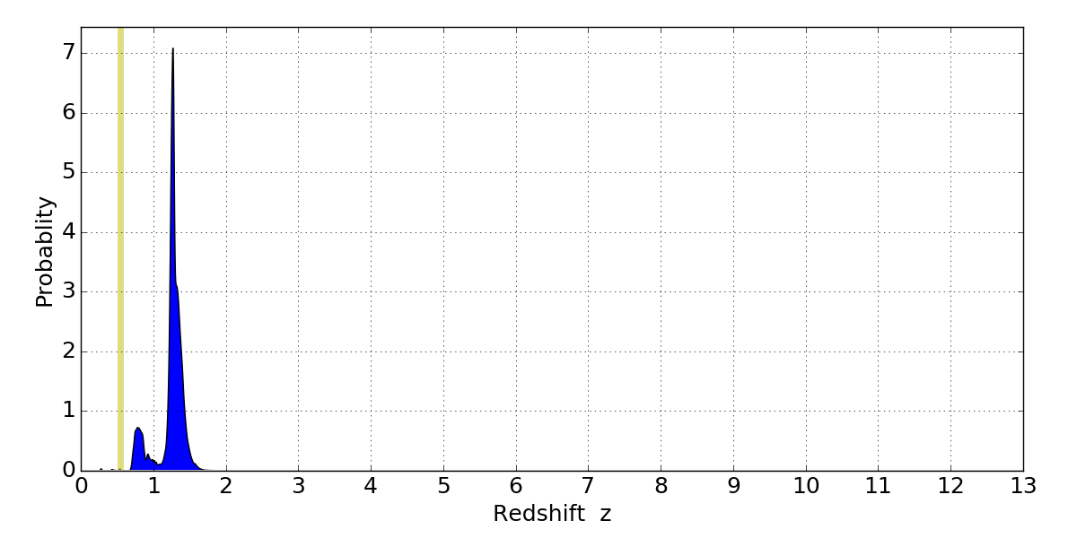In P(z) plots: Yellow lines mark the cluster redshift z = 0.546,