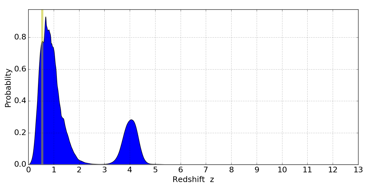 In P(z) plots: Yellow lines mark the cluster redshift z = 0.546,