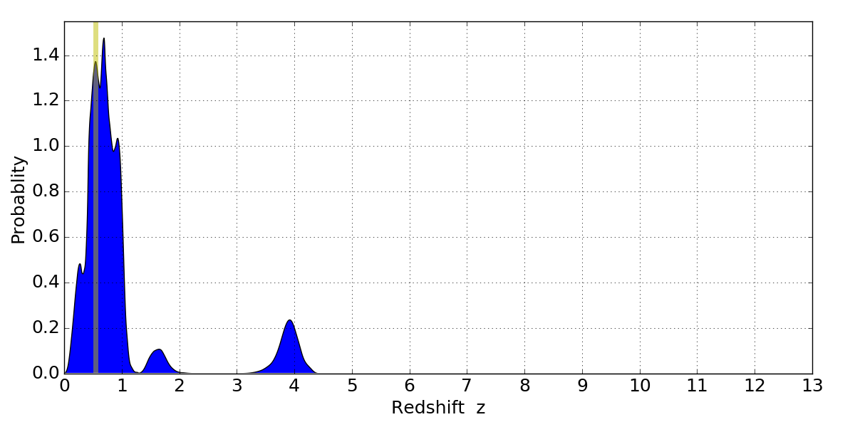 In P(z) plots: Yellow lines mark the cluster redshift z = 0.546,