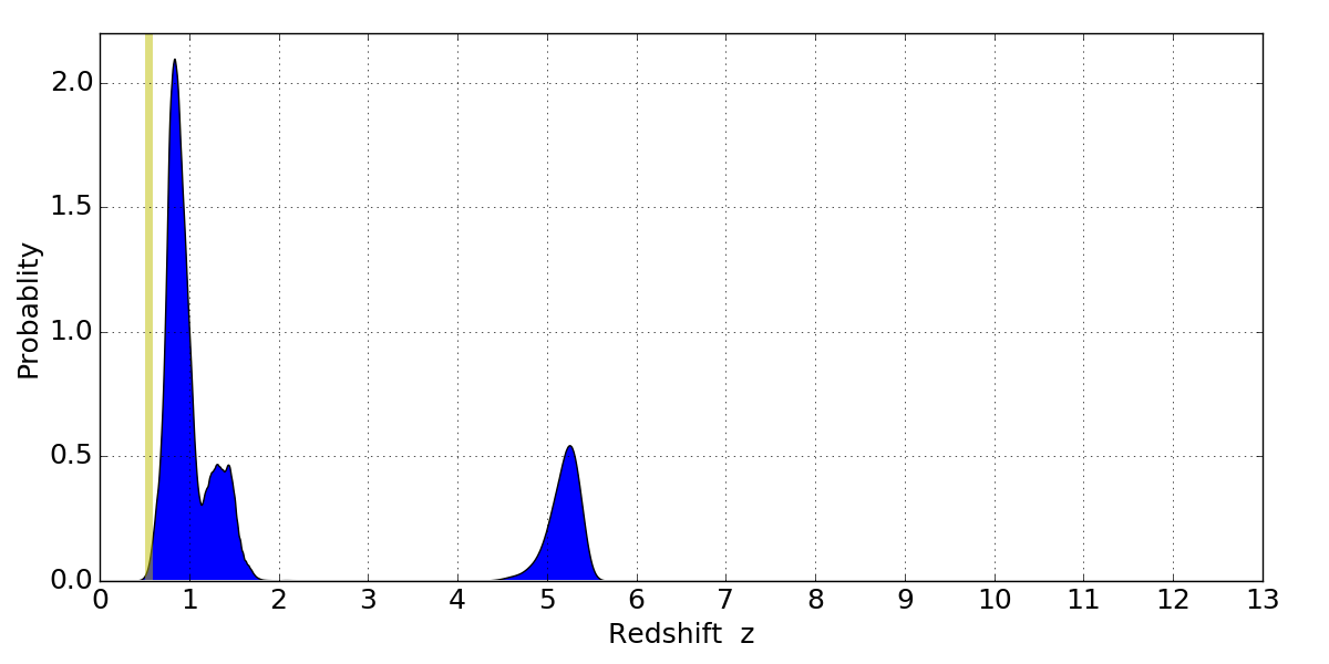 In P(z) plots: Yellow lines mark the cluster redshift z = 0.546,