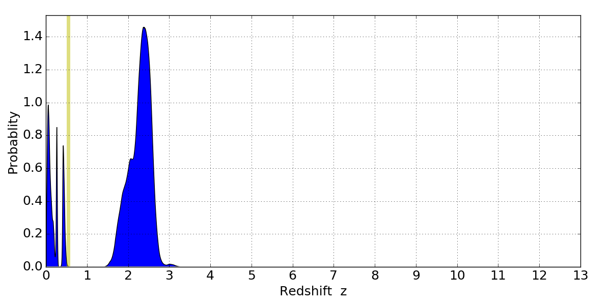 In P(z) plots: Yellow lines mark the cluster redshift z = 0.546,