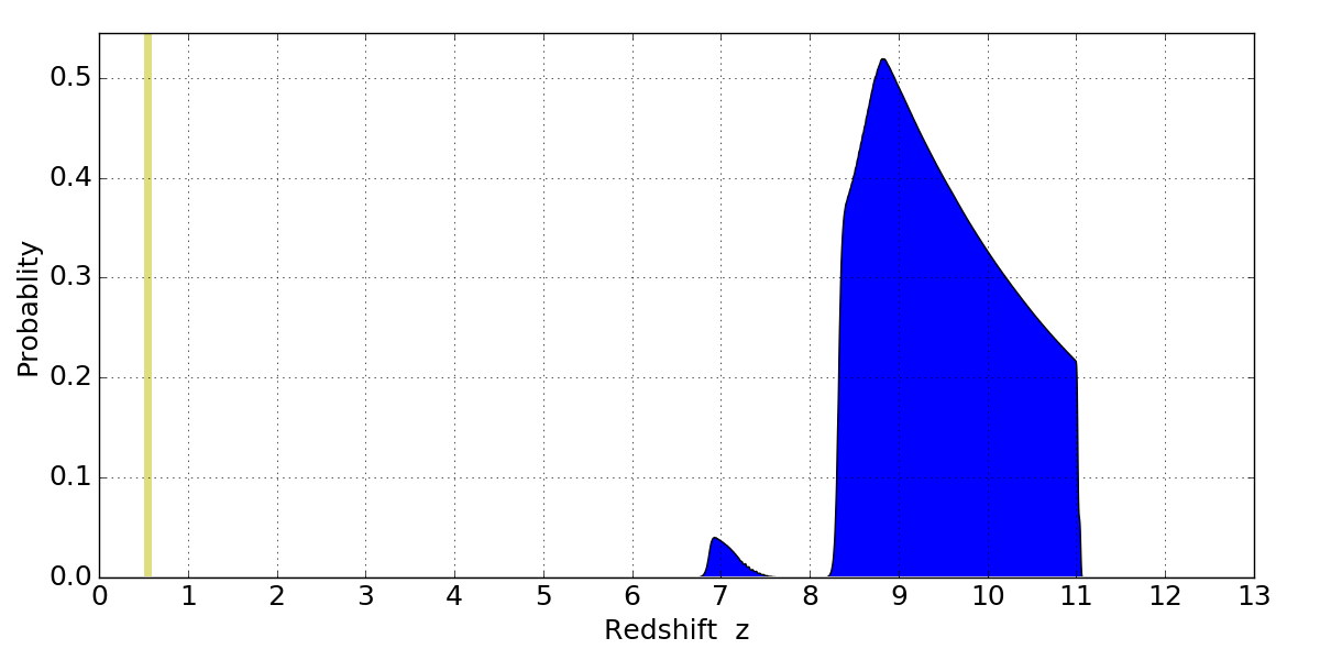 In P(z) plots: Yellow lines mark the cluster redshift z = 0.546,