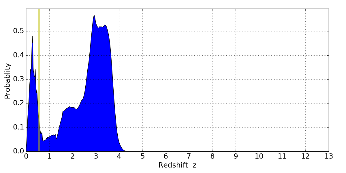 In P(z) plots: Yellow lines mark the cluster redshift z = 0.546,