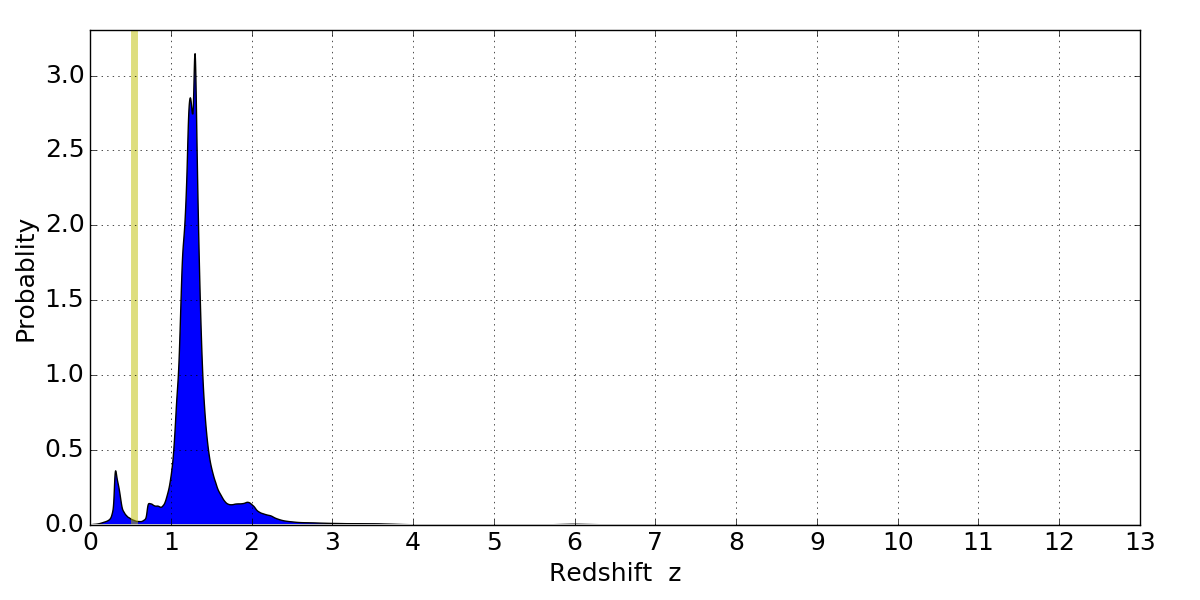 In P(z) plots: Yellow lines mark the cluster redshift z = 0.546,