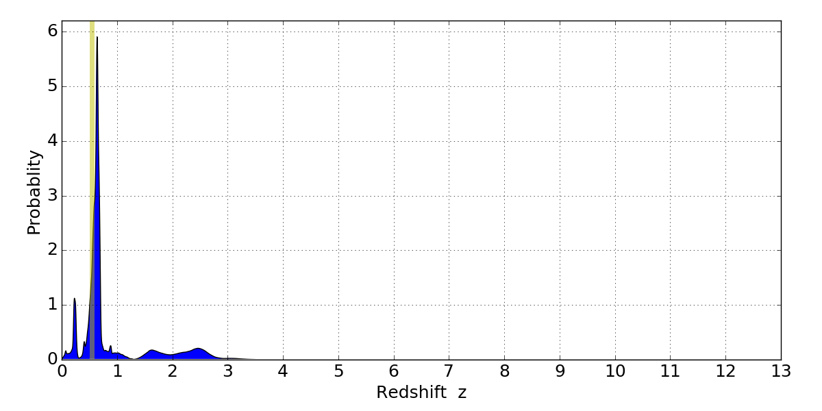 In P(z) plots: Yellow lines mark the cluster redshift z = 0.546,