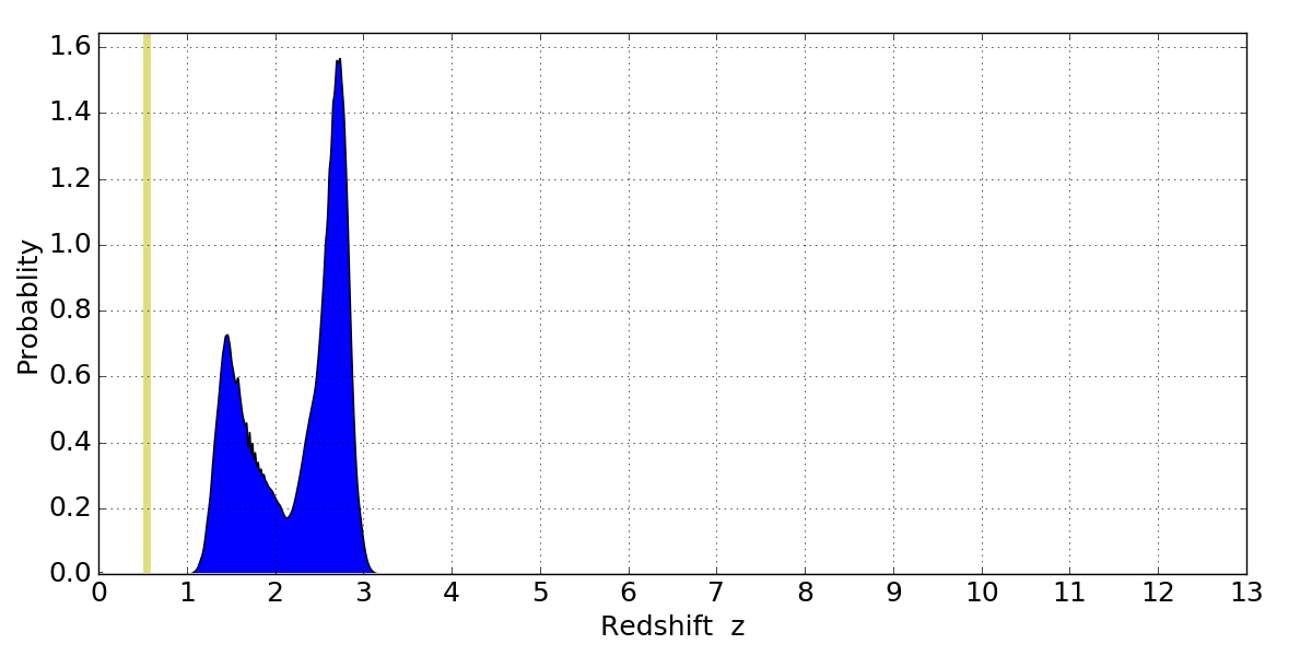 In P(z) plots: Yellow lines mark the cluster redshift z = 0.546,