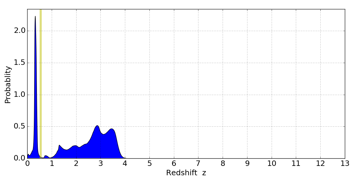 In P(z) plots: Yellow lines mark the cluster redshift z = 0.546,