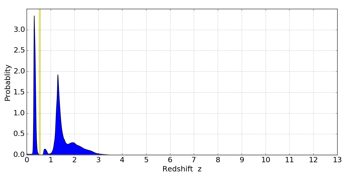 In P(z) plots: Yellow lines mark the cluster redshift z = 0.546,