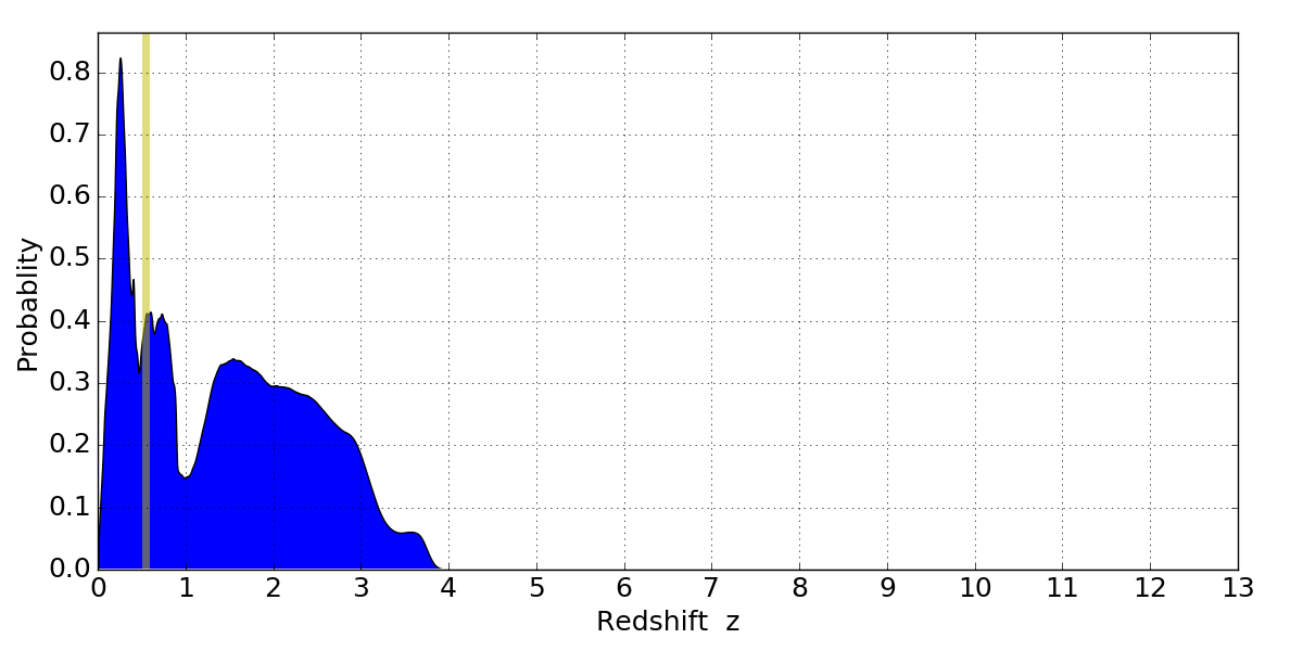 In P(z) plots: Yellow lines mark the cluster redshift z = 0.546,