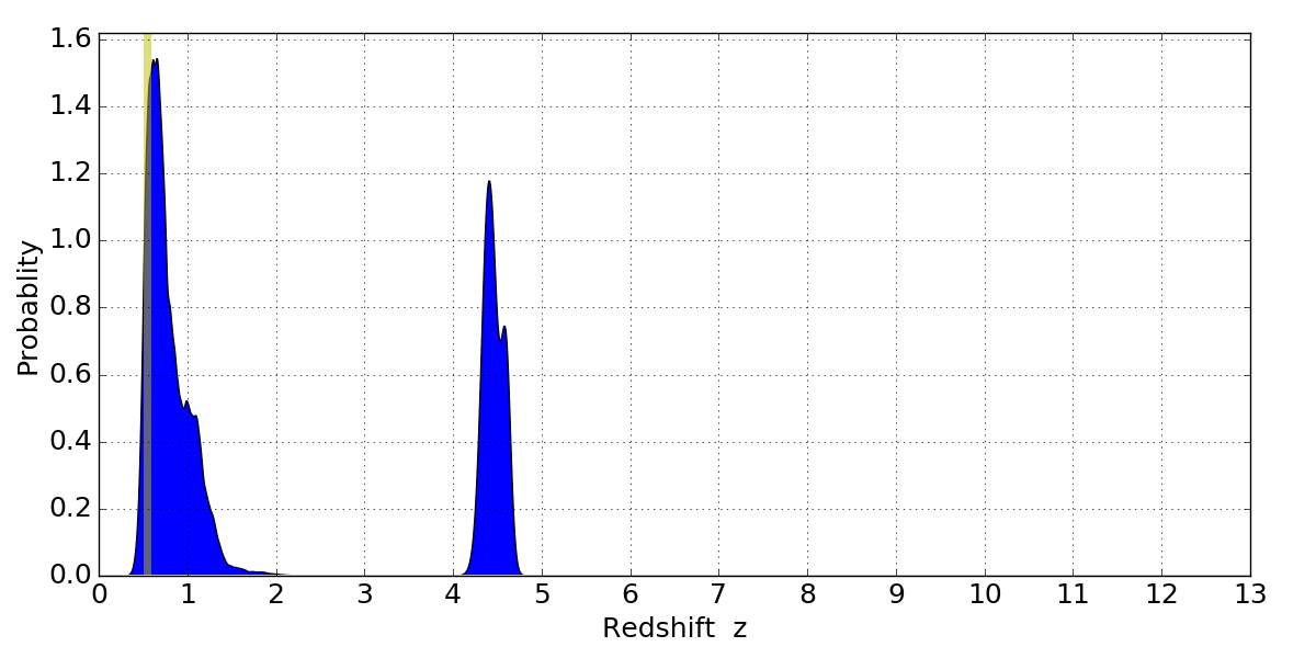 In P(z) plots: Yellow lines mark the cluster redshift z = 0.546,