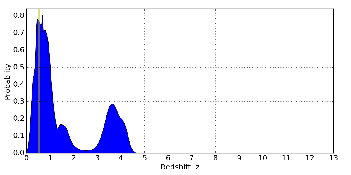 In P(z) plots: Yellow lines mark the cluster redshift z = 0.546,