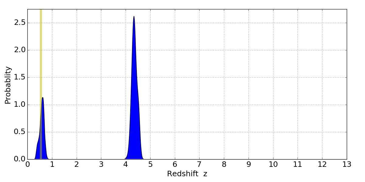 In P(z) plots: Yellow lines mark the cluster redshift z = 0.546,
