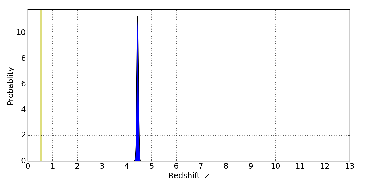 In P(z) plots: Yellow lines mark the cluster redshift z = 0.546,