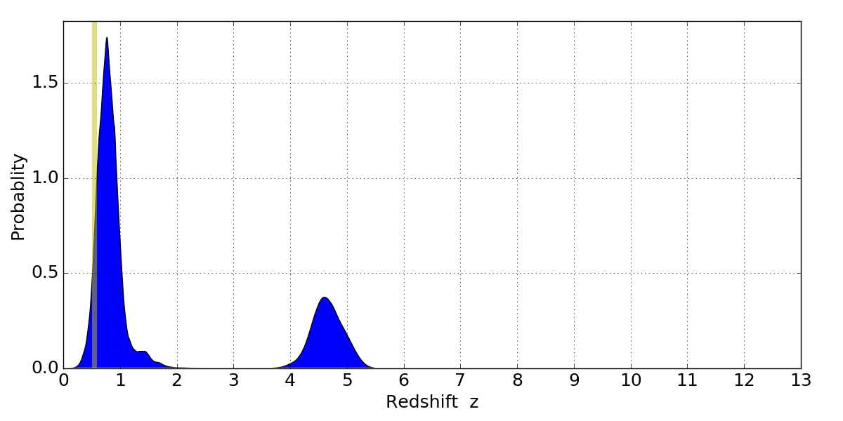 In P(z) plots: Yellow lines mark the cluster redshift z = 0.546,