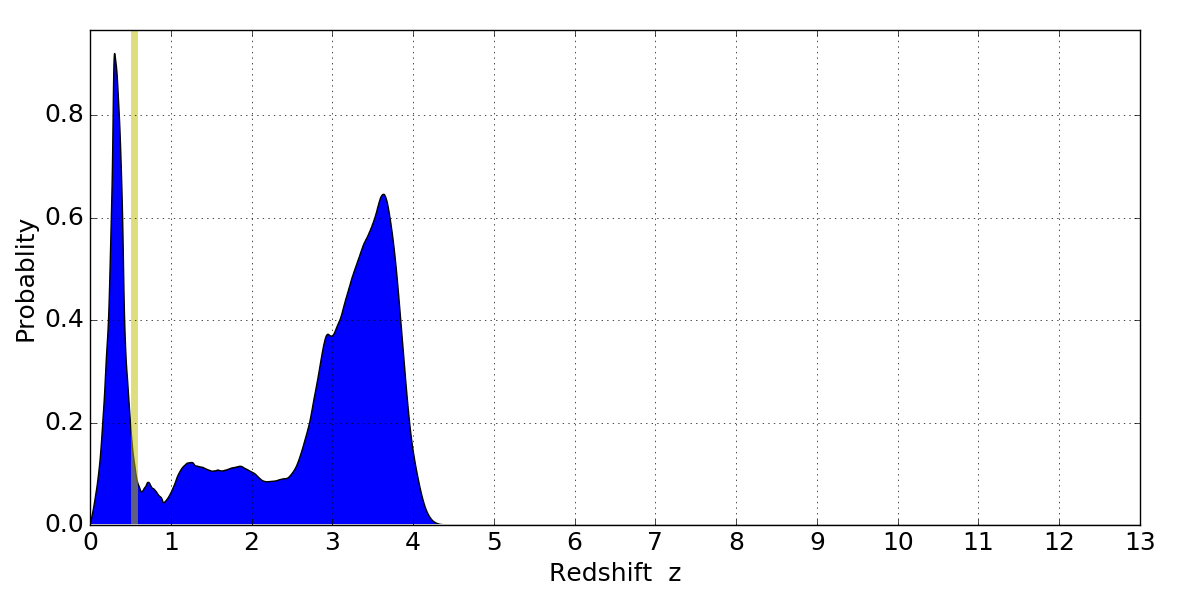 In P(z) plots: Yellow lines mark the cluster redshift z = 0.546,