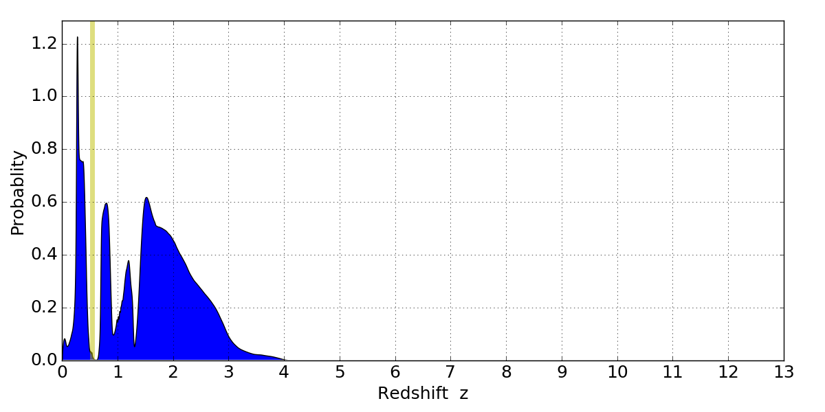 In P(z) plots: Yellow lines mark the cluster redshift z = 0.546,