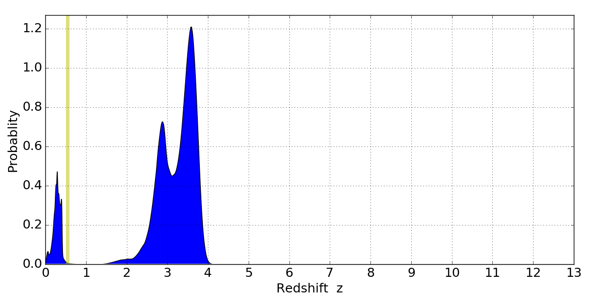In P(z) plots: Yellow lines mark the cluster redshift z = 0.546,