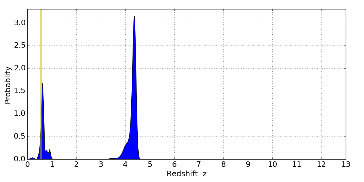 In P(z) plots: Yellow lines mark the cluster redshift z = 0.546,