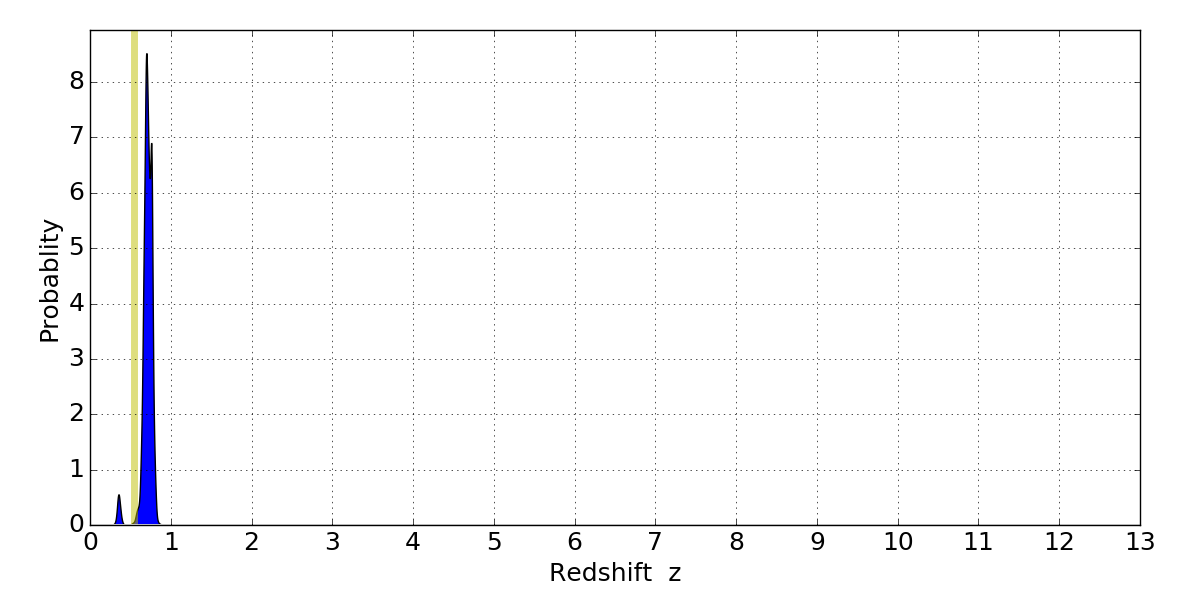 In P(z) plots: Yellow lines mark the cluster redshift z = 0.546,