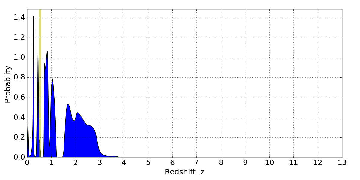 In P(z) plots: Yellow lines mark the cluster redshift z = 0.546,