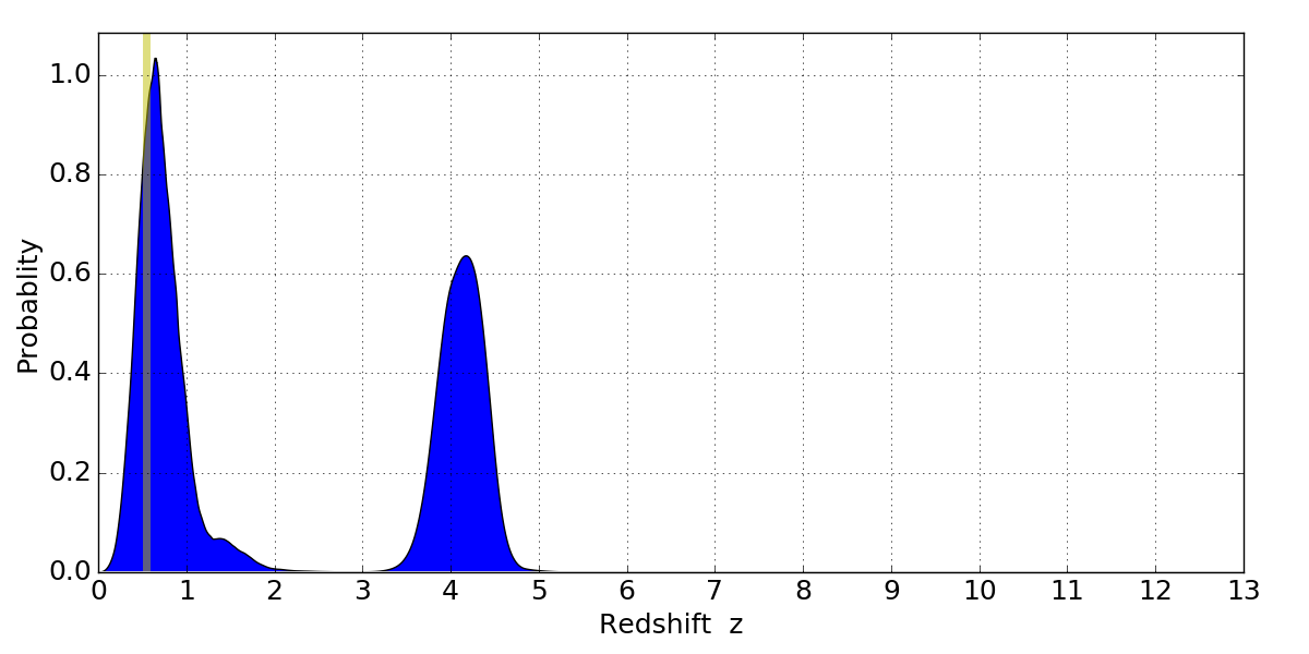 In P(z) plots: Yellow lines mark the cluster redshift z = 0.546,