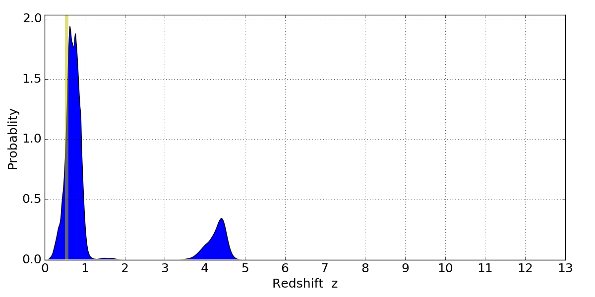 In P(z) plots: Yellow lines mark the cluster redshift z = 0.546,