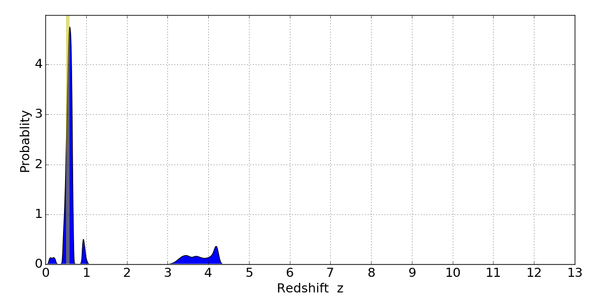 In P(z) plots: Yellow lines mark the cluster redshift z = 0.546,