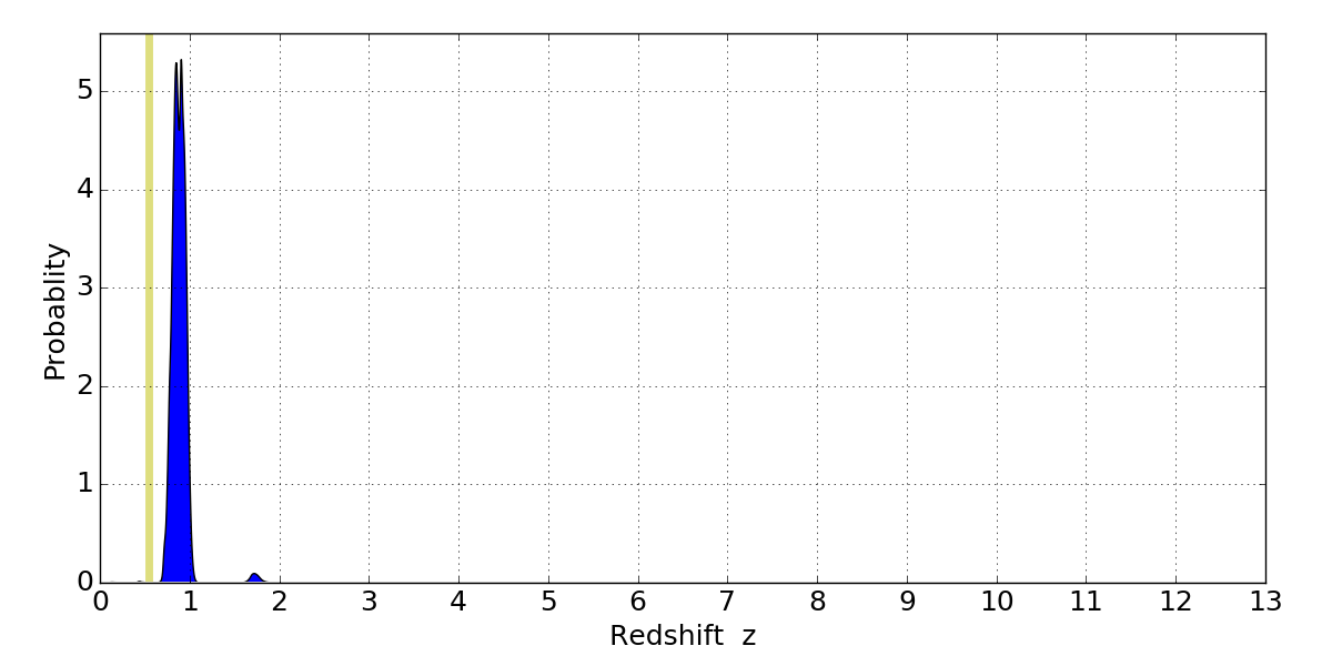 In P(z) plots: Yellow lines mark the cluster redshift z = 0.546,